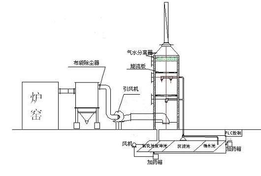 煙氣通過布袋除塵器后,99%的塵埃被除去,由自動卸灰器排出;煙氣在引風(fēng)機(jī)的作用下,進(jìn)入噴淋霧化裝置,當(dāng)洗滌水中加有堿液時(PH值≥9),堿液良好的霧化,當(dāng)二氧化硫氣體通過文丘里時候,能夠很好的與堿液混合反應(yīng),達(dá)到初步的脫硫效果。此后煙氣進(jìn)入脫硫塔筒體進(jìn)入脫硫塔底部沖擊器,流速為17m/s的氣流高速沖擊塔內(nèi)液面而產(chǎn)生密集氣泡,使細(xì)微塵埃落入循環(huán)液中,部分SO2氣體與堿液發(fā)生中和反應(yīng);煙氣在旋流板的作用下旋轉(zhuǎn)上升,以延長煙氣在塔內(nèi)的滯留時間;密集型強(qiáng)霧化置在塔內(nèi)形成全霧化氣幕,使煙氣與堿液充分接觸,完成完全的中和反應(yīng),達(dá)到***脫硫的目的。被水霧濕潤的塵粒流到脫硫塔底部,從溢流孔排走。在筒體底部封底并設(shè)有水封槽以防止煙氣從底部漏出,有清理孔便于進(jìn)行筒體底部清理。脫硫后廢水由底部溢流孔排出進(jìn)入沉淀池,沉淀中和,循環(huán)使用。帶水煙氣上升到上層旋板時,部分濕潤煙氣由于旋流板的作用,產(chǎn)生氣水分離,然后進(jìn)入格刪型脫水裝置,實(shí)現(xiàn)更***的汽水分離,潔凈煙氣進(jìn)入煙囪排入大氣。