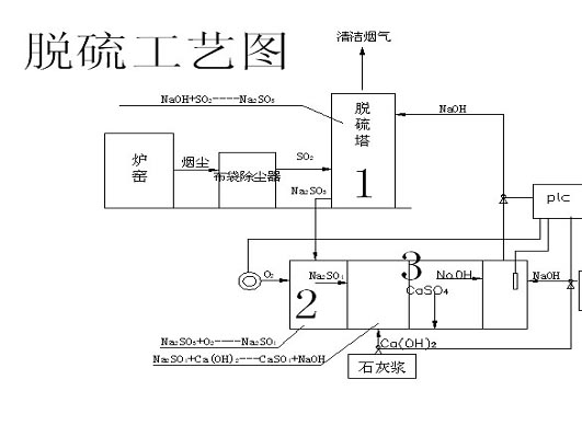 煙氣進(jìn)入脫硫塔①氫氧化鈉發(fā)生中和反應(yīng),主要生成物亞硫酸鈉,亞硫酸鈉極不穩(wěn)定,進(jìn)入氧化池②與氧氣發(fā)生反應(yīng),生產(chǎn)穩(wěn)定的硫酸鈉,硫酸鈉與石灰水在綜合反應(yīng)池③內(nèi)發(fā)生復(fù)分解反應(yīng),生成石膏(沉淀)和氫氧化鈉,實(shí)現(xiàn)再生利用。